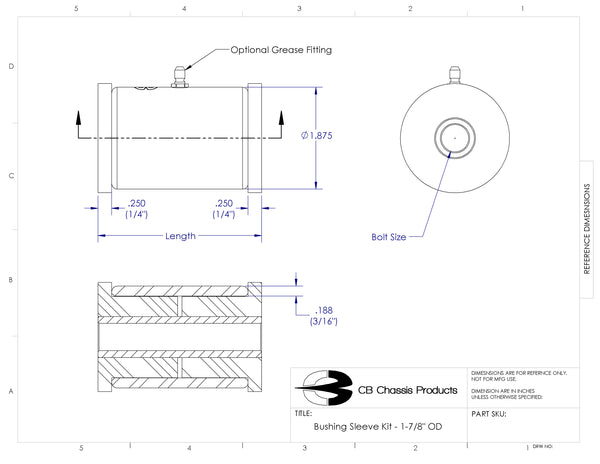 Our bushing sleeves kits are the highest quality available and perfect for suspension links, control arms or anything that requires a bushing joint. Our sleeves feature a fully machined outside that not only looks fantastic, but require no surface preparation for welding. A smooth outside radius and chamfered inside edge protect the polyurethane bushings from sharp edges and prevent premature wear. The outer sleeve is CNC machined from 1-7/8" 1026 DOM and the zinc plated inner sleeve is available for multiple bolt sizes. The overall length of each size includes the bushing thickness. Available with or without a grease fitting.
