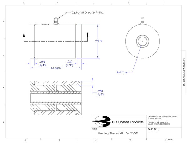 Our Heavy Duty bushing sleeves kits are the highest quality available and perfect for suspension links, control arms or anything that requires a tough bushing joint. Our sleeves feature a fully machined outside that not only looks fantastic, but require no surface preparation for welding. A smooth outside radius and chamfered inside edge protect the polyurethane bushings from sharp edges and prevent premature wear. The outer sleeve is CNC machined from thick wall 2" 1026 DOM and the zinc plated inner sleeve is available for multiple bolt sizes. The overall length of each size includes the bushing thickness. Available with or without a grease fitting.
