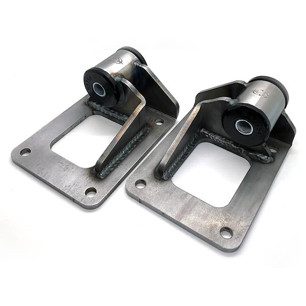 Chevy LT universal engine motor mounts for engine conversions. They feature a thick .250" base plate, machined .188 wall DOM bushing sleeve, durable polyurethane bushings and zinc plated inner sleeve for a 1/2" bolt. These are for Chevy LT series of engines. Includes block mounting hardware. Sold as a set.